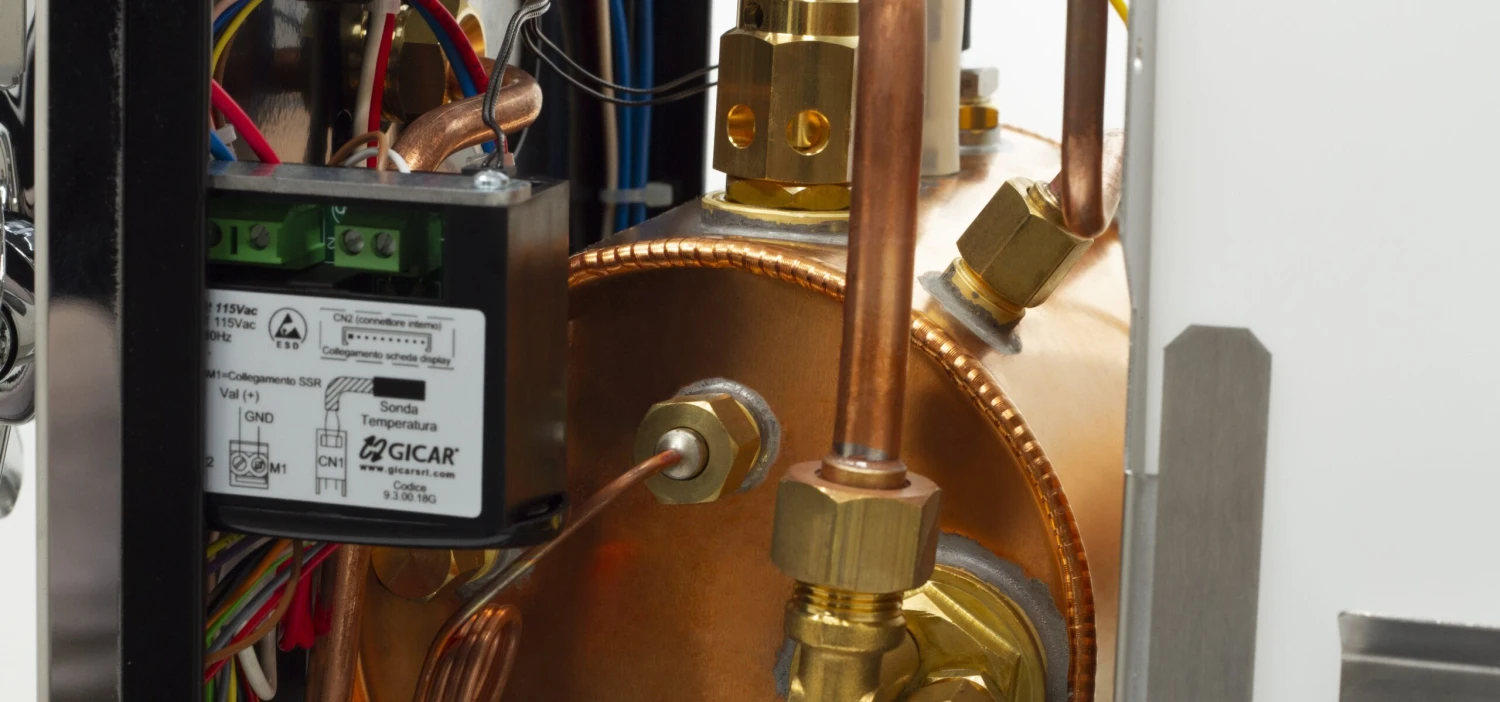 On the outside, the Magica PID flaunts elegant rosewood accents on the steam and hot water taps, E61 lever, and portafilters. The iconic E61 group with the Bezzera portafilters, steam and hot water joysticks, dual pressure gauges, and of course the iconic Biscione logo make for a timeless aesthetic. Not a small machine, the Magica PID’s wide drip tray provides ample space for cups, while the cup warmer itself has plenty of room for cappuccino/latte drinkware.