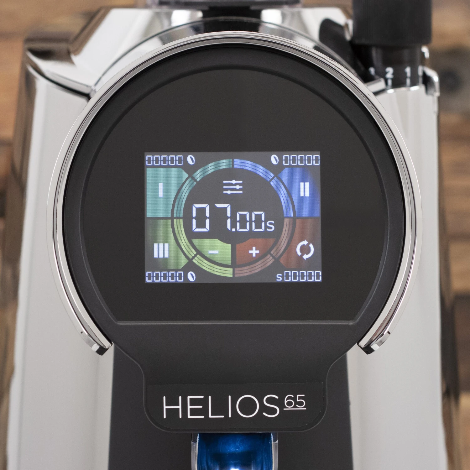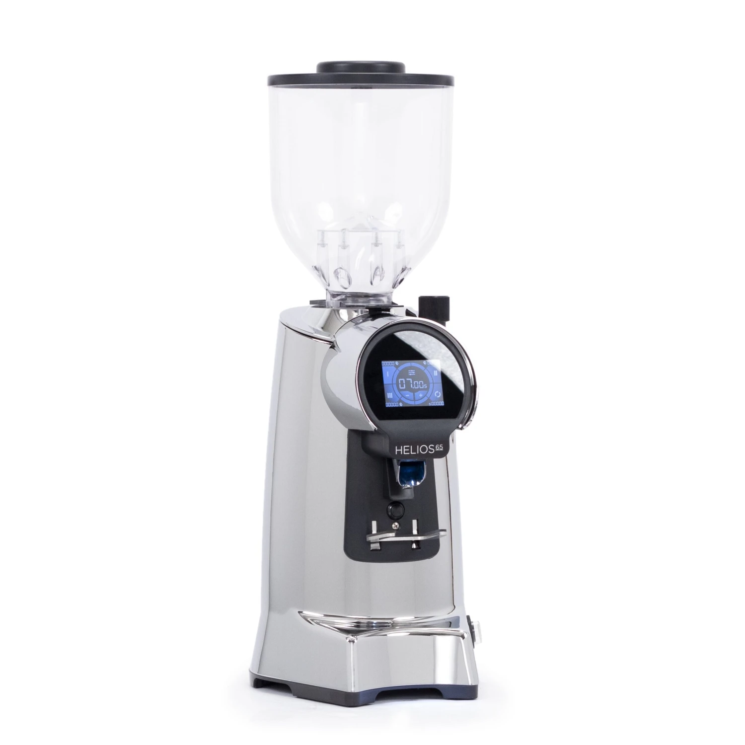 The Eureka Helios 65 is a high speed espresso grinder with intuitive touchscreen controls, 65mm flat burrs, and stepless micrometric grind adjustment. The touchscreen display stores 3 timed-grinding presets, a manual grinding option, and more.