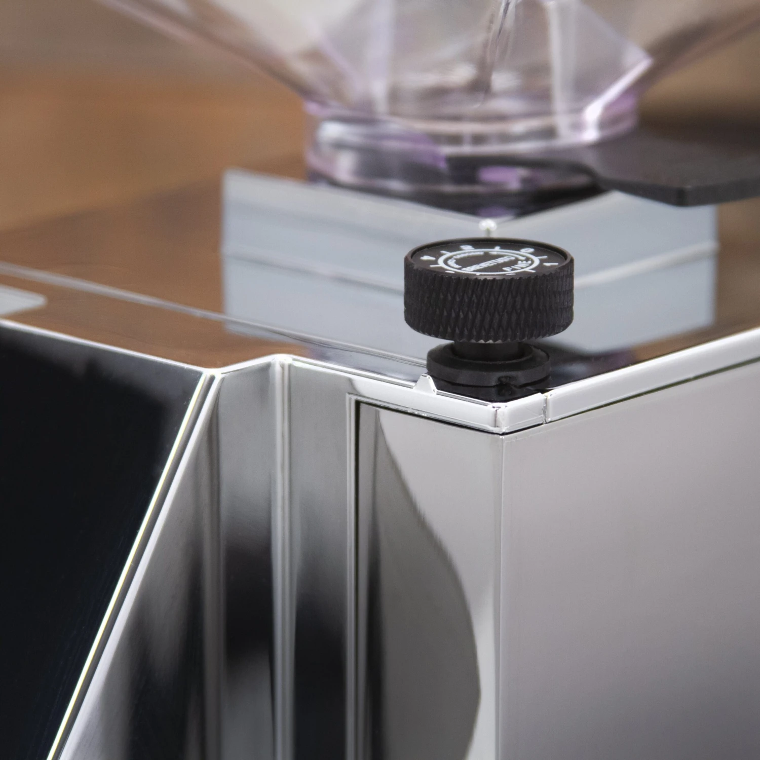 For performance, it’s equipped with 50 mm flat hardened steel burrs and a strong 1350 RPM motor. Eureka’s ACE system helps prevent clumping by eliminating static in ground coffee, which in turn ensures dose consistency.