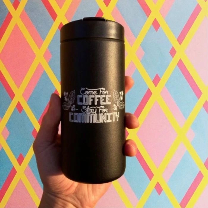 Whether you enjoy your coffee on the go, or just want to keep it hot (or cold) around the house, the Fuego Coffee Roasters tumbler has got you covered. This 12 oz insulated stainless steel tumbler is decorated with the Fuego logo and with the words “Come for the Coffee, Stay for the Community” and features art by Rochester local artist CW Brackett.