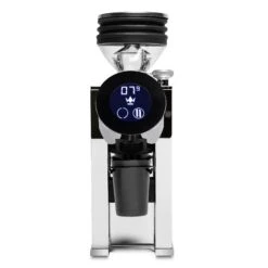 The Mazzer Kony is a stepless, doser grinder with manual timed grinding functionality. Its large 63mm conical burrs spin at a low speed speed of 500 RPM, which speedily delivers grounds into the doser without heating up the burrs. The extra large hopper can hold just under three pounds of coffee, and the timer dial operation can grind in up to sixty second increments for continual use. The grounds are deposited into a large doser, which can be adjusted to dispense anywhere from 5.5 to 9 grams into your portafilter with a flick of the dosing lever. Just like the Mazzer Royal, the Kony’s doser can dispense up to twelve pre-portioned amounts before needing to be refilled, which it can do automatically, and those grinds can then be easily tamped with the built-in tamper. Both the doser and its built-in tamper are designed with high-volume scenarios in mind, where you want to be able to quickly grind and tamp for several drinks in a row. We think the Mazzer Kony is a ten out of ten, and we definitely recommend.
